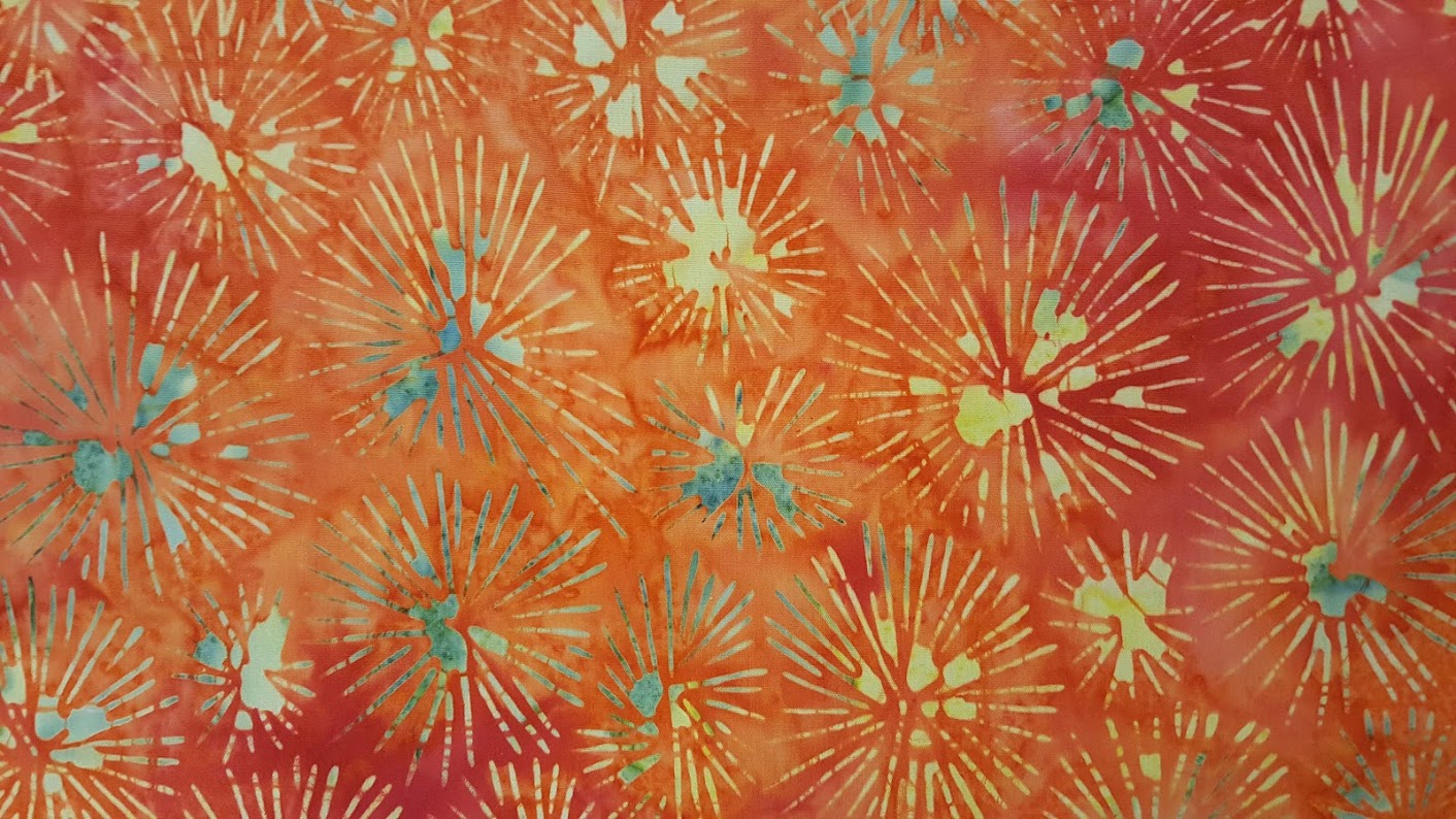 Batik Printed Palette 2019 is a collection of 100% cotton premium printed batiks from Indonesia, ideal for quilting or other fabric crafts. BA491 has blue sunbursts on an red background.