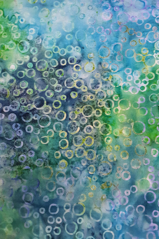 Batik Printed Palette 2019 is a collection of 100% cotton premium printed batiks from Indonesia, ideal for quilting or other fabric crafts. BA495 has yellow and light purple bubbles on a green background..