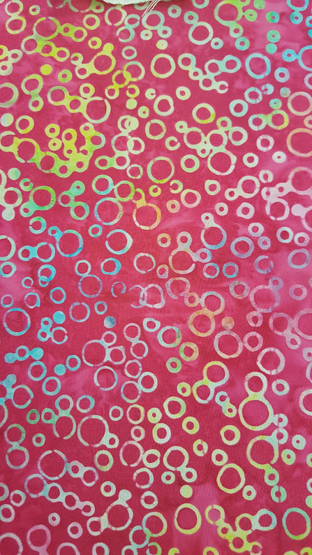 Batik Printed Palette 2019 is a collection of 100% cotton premium printed batiks from Indonesia, ideal for quilting or other fabric crafts. BA497 has multi coloured bubbles on a pink background..