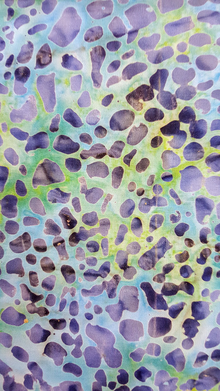 Batik Printed Palette 2019 is a collection of 100% cotton premium printed batiks from Indonesia, ideal for quilting or other fabric crafts. BA501 has purple cheetah spots on a blue and green background..