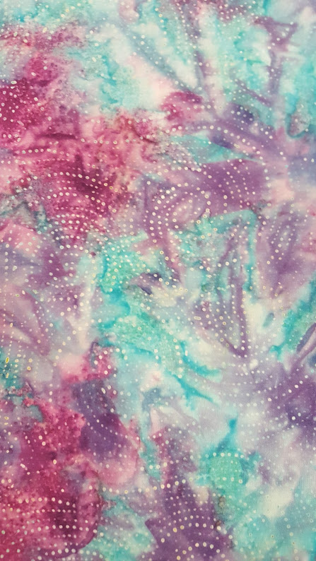 Batik Printed Palette 2019 is a collection of 100% cotton premium printed batiks from Indonesia, ideal for quilting or other fabric crafts. BA509 has white dotted spirals on a purple and turquoise background..