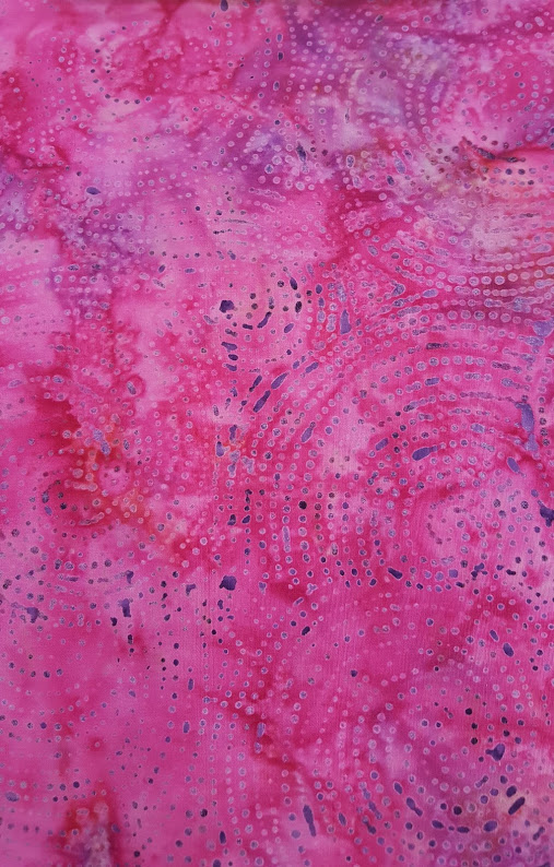 Batik Printed Palette 2019 is a collection of 100% cotton premium printed batiks from Indonesia, ideal for quilting or other fabric crafts. BA511 has purple dotted spirals on a pink background..
