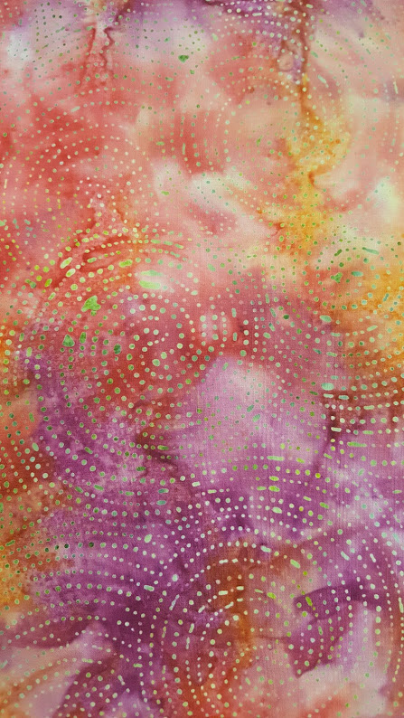 Batik Printed Palette 2019 is a collection of 100% cotton premium printed batiks from Indonesia, ideal for quilting or other fabric crafts. BA512 has multi coloured dotted spirals on a purple and orange background..