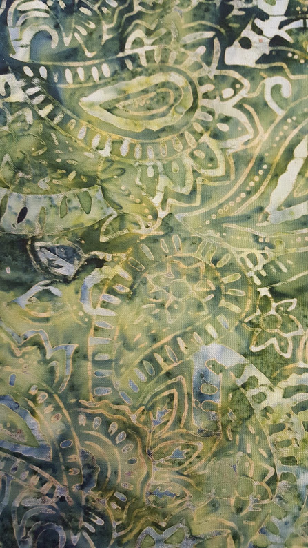 Batik Printed Palette 2019 is a collection of 100% cotton premium printed batiks from Indonesia, ideal for quilting or other fabric crafts. BA515 is an abstract paisley pattern on a green multi coloured background.