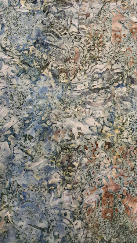 Batik Printed Palette 2019 is a collection of 100% cotton premium printed batiks from Indonesia, ideal for quilting or other fabric crafts. BA516 is an abstract paisley pattern on a grey multi coloured background..