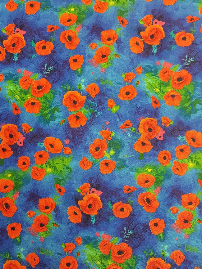 Poppy Bunches is a good quality, pure cotton quilting fabric,115 cms (45 inches) wide. It is a pretty design with bunches of red and orange poppies with green leaves on a light and dark blue background.