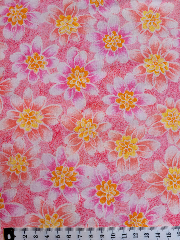 Soft pretty flowers in yellow, orange, salmon, violet and white on a smudged pink background