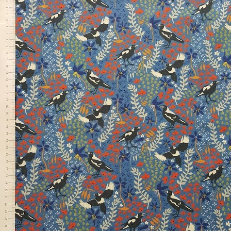 Black and white Magpies in various natural poses among vibrant wildflowers on blue background. Remnant 30cm by WOF