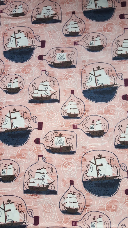 Novelty print of dark brown ship, white sails and kraken arms in bottle,