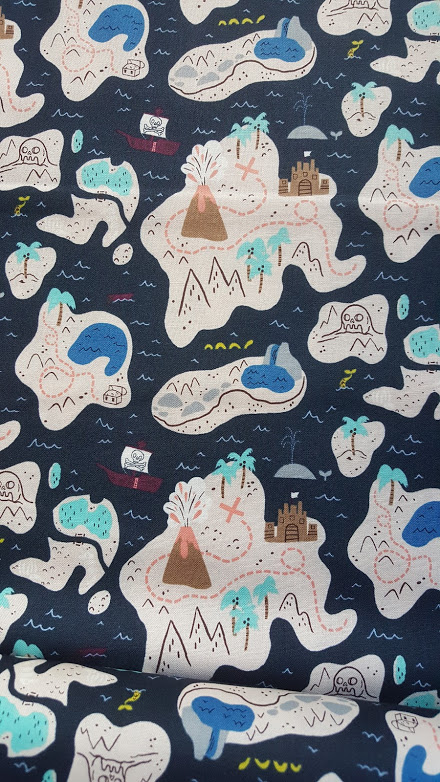 Novelty print of multiple treasure islands with pirate themed drawings in white, grey, blue, aqua, including black line drawings on a deep sea blue background.