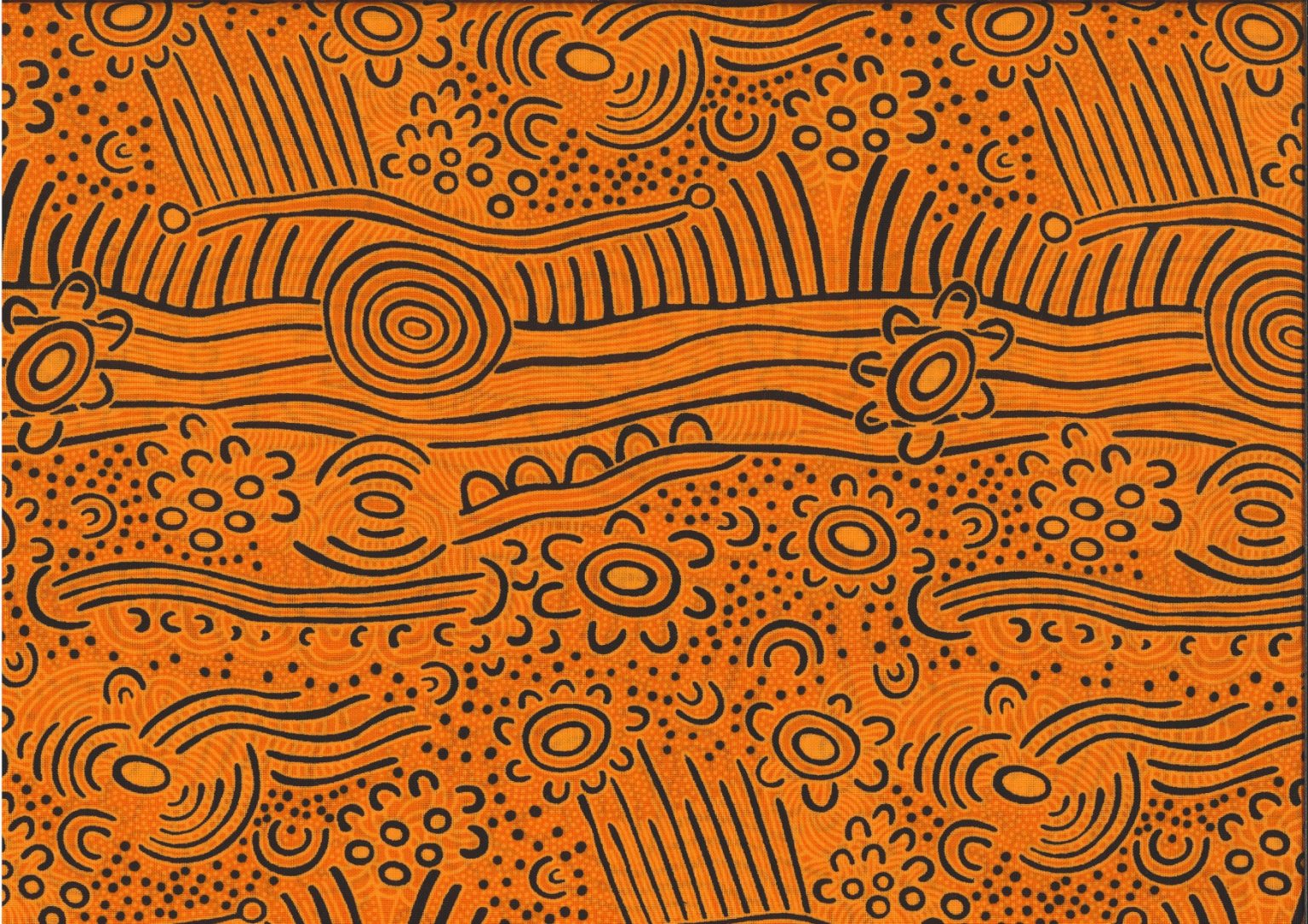 Cotton - design made from circles, lines and dots drawn in dark brown on gold and orange background. Design bt Janet Long Nakamarra.