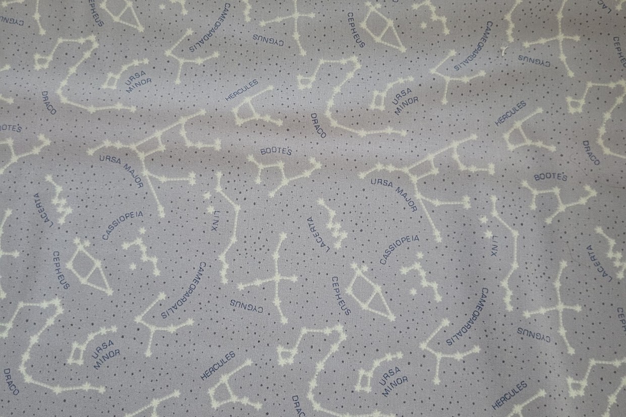 White constellations on a light grey background with dark grey names. From the range Light Years by Lewis and Irene.