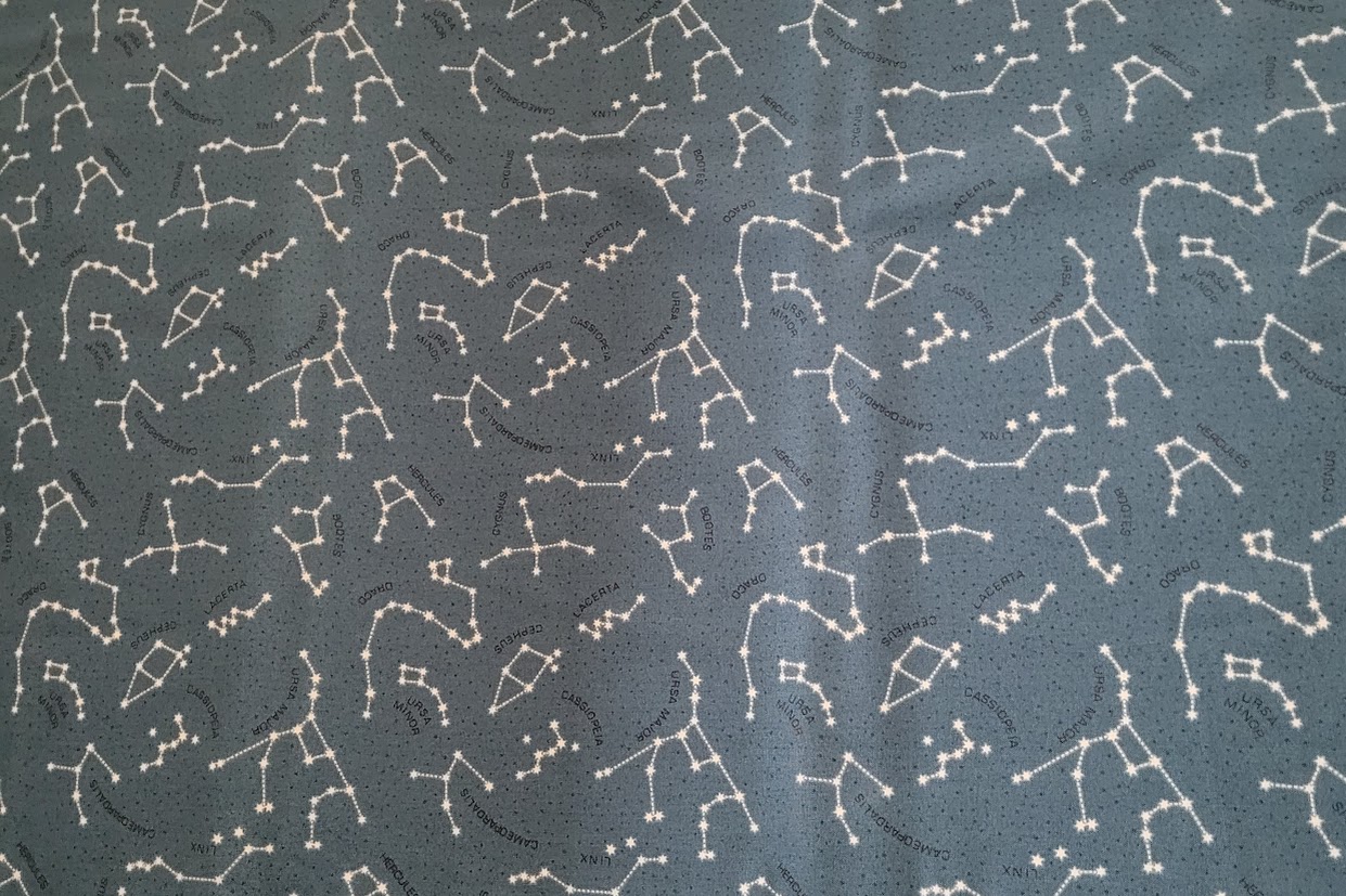 White constellations on a teal blue background with dark blue names. From the range Light Years by Lewis and Irene.