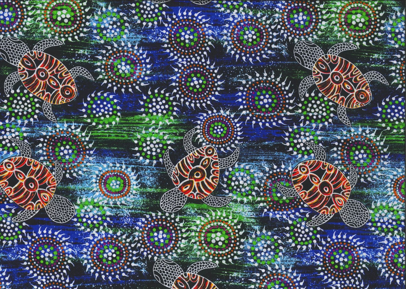 Cotton - turtles drawn in orange, red, black and white and circles represented by dots of white, green and red on a background of painted lines in blue, black and green with white splatters. Design by Heather Kennedy.