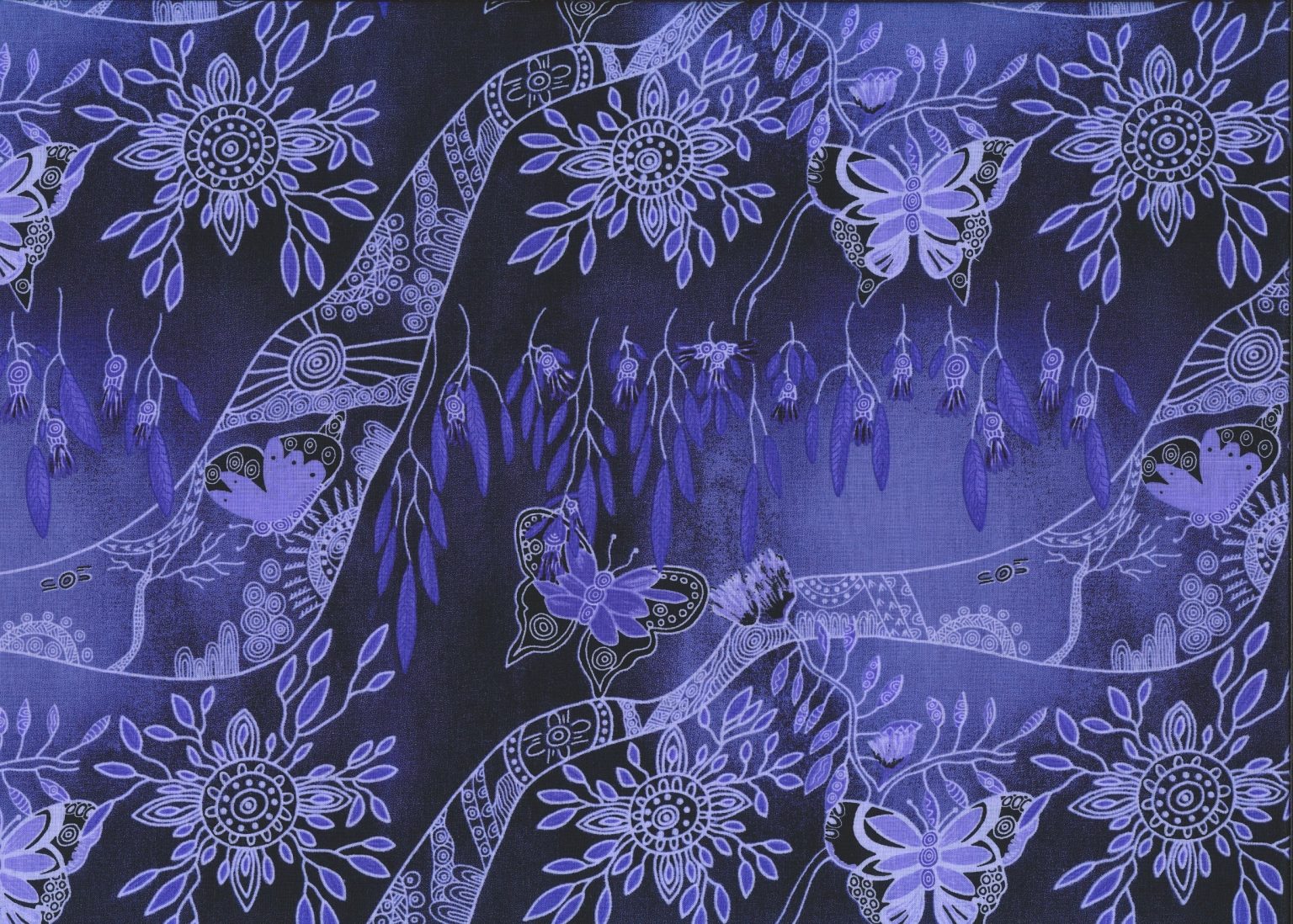 Cotton - butterflies and vegetation in dark purple and white on a background of shaded light purple and charcoal. Design by Heather Kennedy.