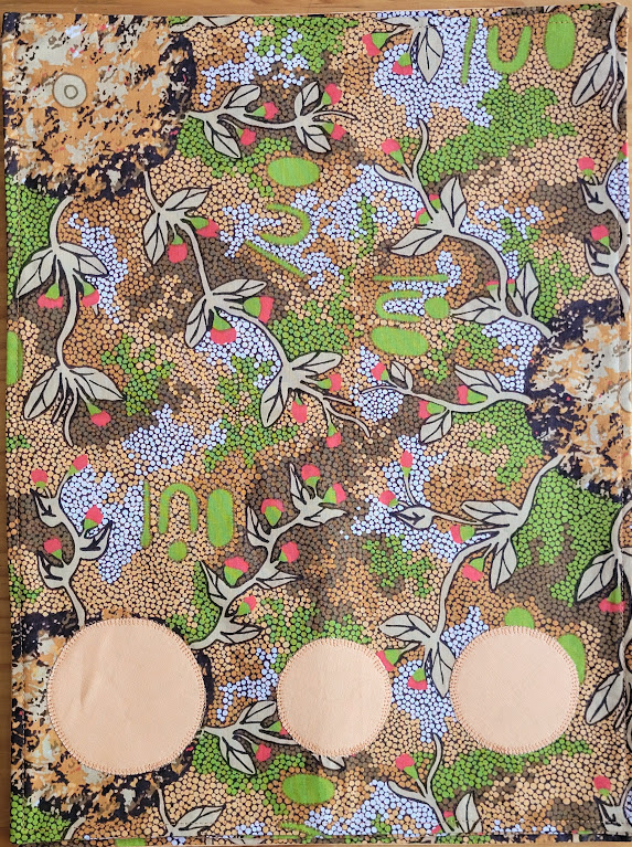 Table placemats, set of 4 @ 30cm by 40cm. Fabric authentic Aboriginal design (AAD), Bush Sweet Potato with apricot coloured contrast circles. Colours include brown, tan, red, light green, dark green, black, white and apricot. 100% cotton fabric, vilene lining.