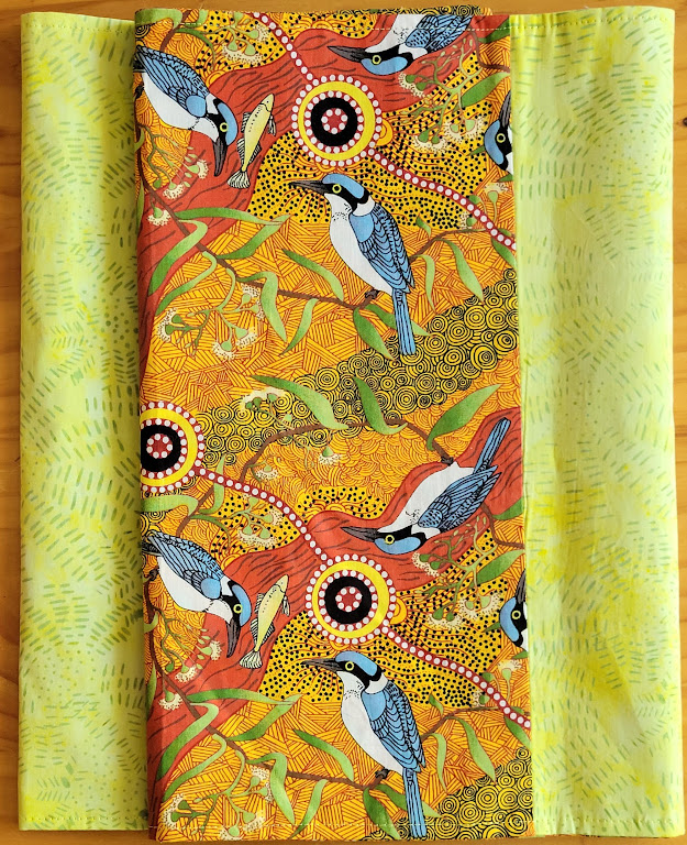 Table runner 34cm by 126cm. Fabric authentic Aboriginal design (AAD), Kingfishers by the Creek with a kingfisher and watercourse print and a green batik centre contrast. Colours include blue, brown, tan, orange, red, light green, dark green, black and white. 100% cotton fabric, vilene lining.