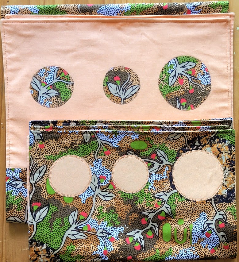Table runner 34cm by 127cm and set of 4 placemats @ 30cm by 40cm. Fabric authentic Aboriginal design (AAD), Bush Sweet Potato, with apricot contrast. Colours include brown, tan, red, light green, dark green, black and white. 100% cotton fabric, vilene lining.