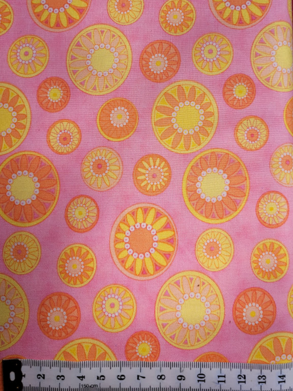 Yellow and orange abstract flowersinside circles on a mid-pink background