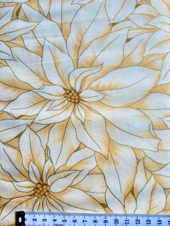 Large all over flower print, butter yellow and white petals with gold "seed' centres, sparkly gold outlining.