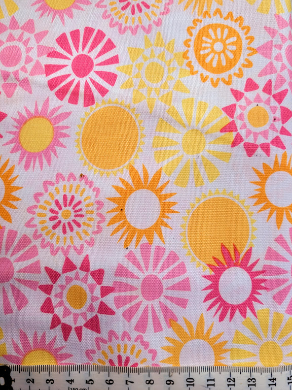 Remnant - 1.8 by WOF. Yellow, orange and pink abstract flowers on a white background
