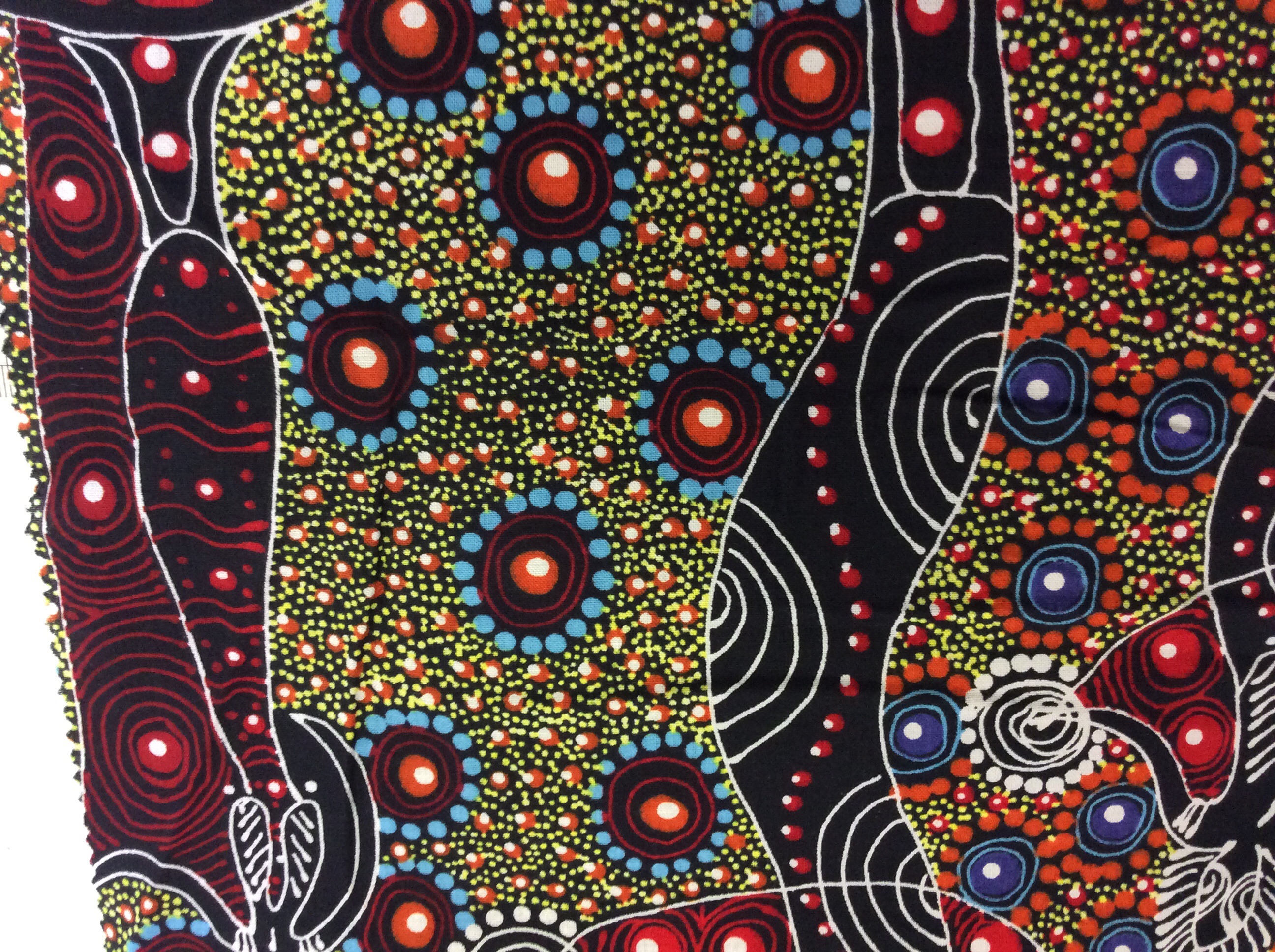Depiction of sacred aboriginal dance in red, blue, yellow, orange and white on a black background.