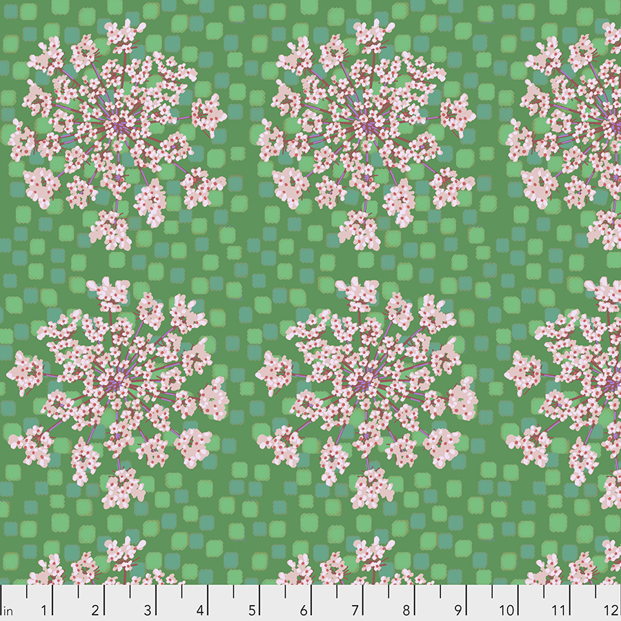 A lovely Anna Marie Horner fabric with delicate pink cherry blossom on a green background, complete with paving stones.