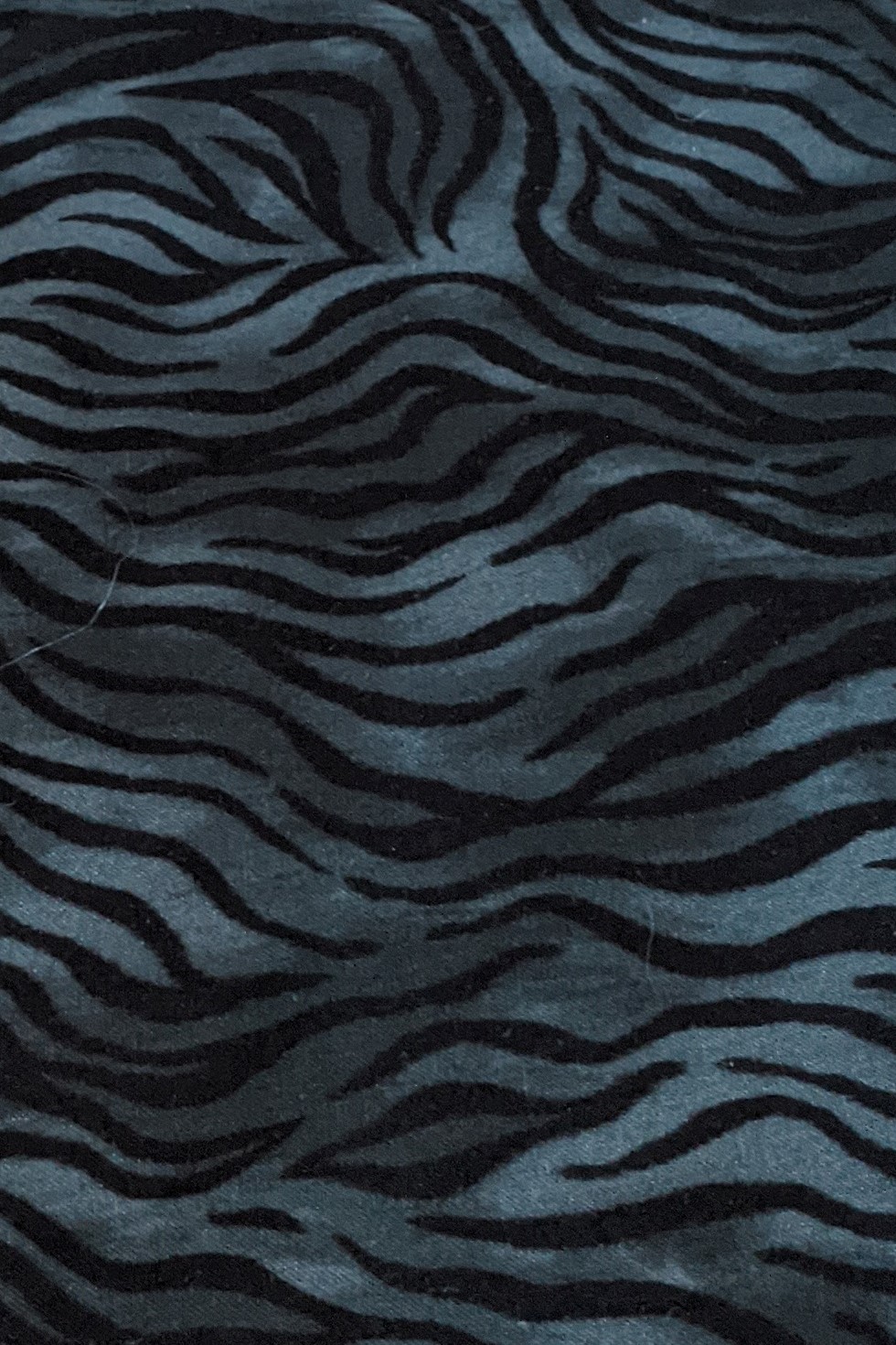 A tiger coat pattern of dark charcoal black on a variegated grey background, slight hint of blue in some lights. 112cm wide