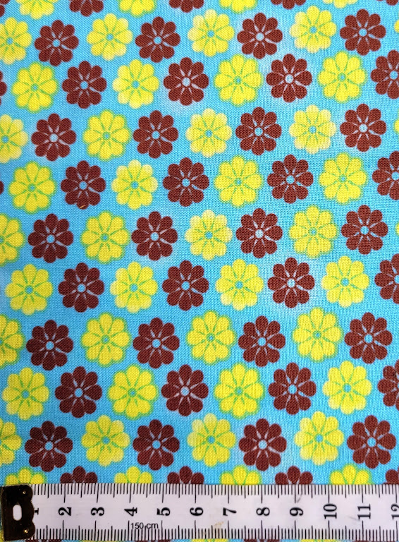 All over light yellow and dark red brown symmetrical flowers on a light blue background.