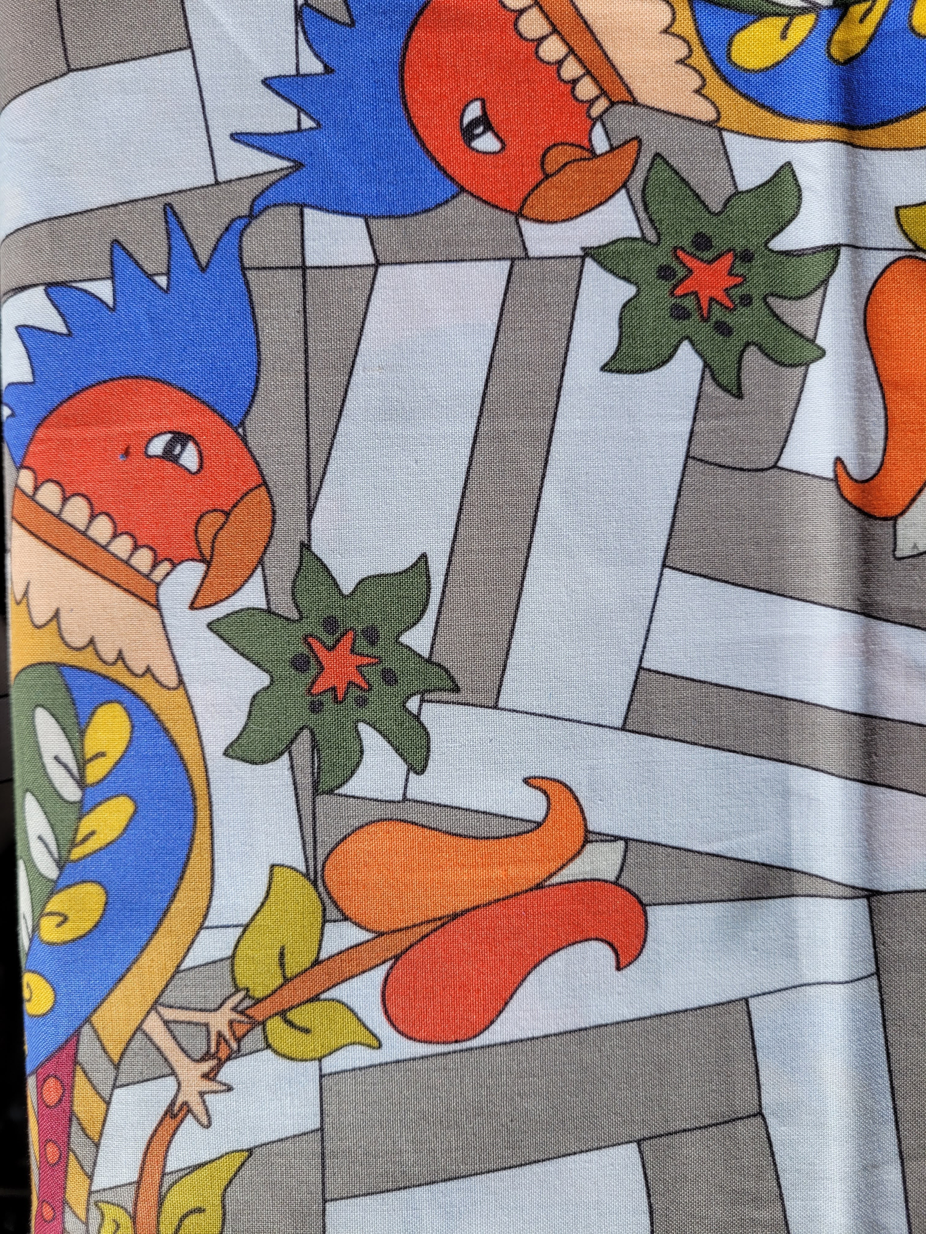 Line drawn folk art. Background of drawn blocks of partial log cabin pattern in white and beige with grey-green centres. Overlaid with sets of two large motifs of parrots on branches with flowers, each approximately 33cm by 33cm, across the width of fabric, with 27cm between each set of motifs along the length of the fabric. Motifs include mid blue, yellow, dark and mid olive green, orange, brown, crimson, peach, dark salmon and white. Design by Kathy Doherty.