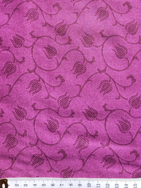 Styllised tulip and vine pattern in dark plum scattered in an all over pattern on amid-plum purple background